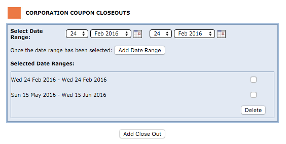 To use this functionality, log in to your eTourism extranet and go to the close out section of your Corporation Coupons menu which is found in the Distribution Menu. You simply add the close out dates and click Add Close Out to save the changes. You would also see and be able delete active close out dates.